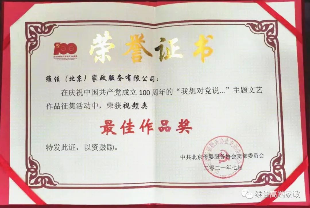 近日,維佳公司拍攝的一段短視頻在北京母嬰服務(wù)協(xié)會主辦的慶祝中國共產(chǎn)黨成立100周年“我想對黨說…”主題文藝作品征集大賽中榮獲視頻類最佳作品獎。